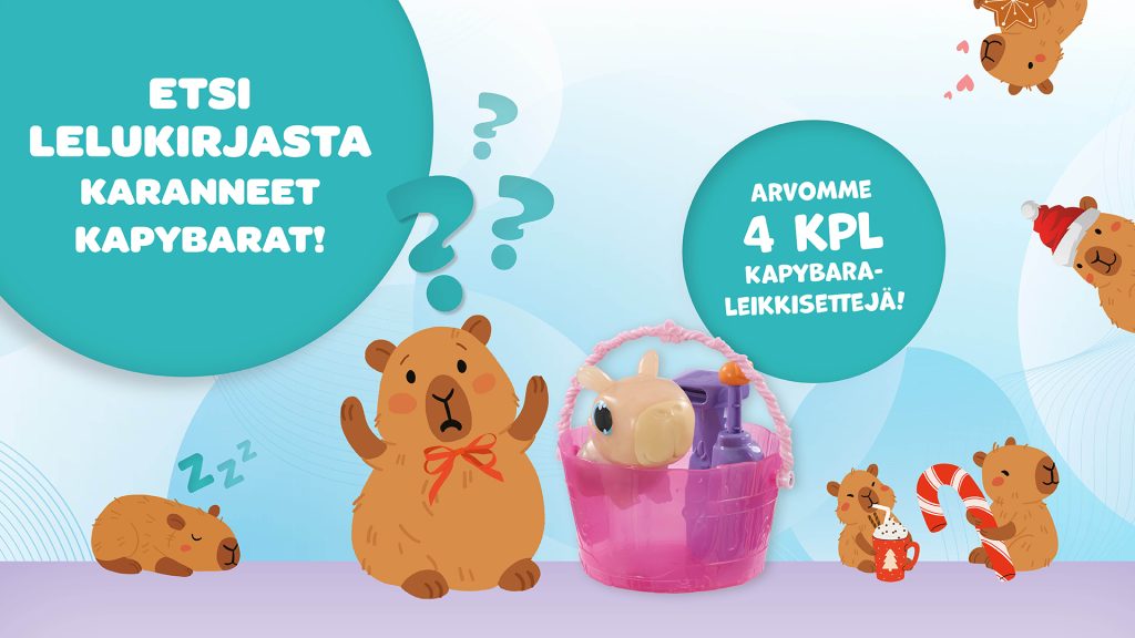 Etsi kuusi (6) kapybaraa tämän joulun Lasten Suuresta Lelukirjasta, syötä löytämäsi sivunumerot sekä omat yhteystietosi tällä sivulla olevaan lomakkeeseen, ja olet mukana kapybara-lelun arvonnassa! Huom. Lelukirjan etu- ja takakannessa sekä puuhatehtävissä olevia kapybaroja ei lasketa mukaan.