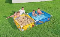 Kompakti kesäleikkikeskus, jossa on erillinen alue vedelle ja hiekalle. Kestävä materiaali ja korroosionkestävä metallikehikko takaavat pitkän käyttöiän. Helppo koota ja purkaa. Koko: 213 × 122 × 30,5 cm. Vesikapasiteetti: 365 litraa. Hiekkakapasiteetti: noin 200 kg. 2+