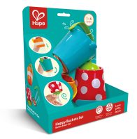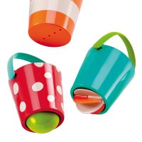 Kolme värikästä sankoa vesileikkeihin. Jokaisessa sangossa on oma hauska toiminto, jonka lapsi saa selville täyttämällä sangon vedellä. Sankojen korkeus 8 cm. Paketin koko: 24x10x24 cm. Ikäsuositus 1+.