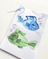 Korttien teemat: nalle, kukka, auto, kalat ja täytekakku.
