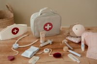 Tämän täydellisen puisen lääkärisetin avulla lapsesi voi astua lääkärin rooliin ja pitää huolta potilaista kuin oikea ammattilainen! Tyylikkäässä kangaskassissa kulkevat kaikki tärkeät lääkärintarvikkeet: lämpömittari, ruisku, siteet, stetoskooppi ja verenpainemittari ja lääkärin lakki! Leikki ei ole vain hauskaa, vaan myös opettavaista. Tämän setin avulla lapsi voi totutella lääkärikäynteihin ja oppia huolehtimaan toisista mielikuvituksen avulla.