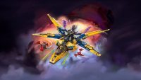 Lähde Arinin ja Rasin mukaan sankareiden kiitäessä supernopealla suihkarillaan kohti korkeuksia NINJAGO®-maailman ylle! Auta Arinia tähtäämään suihkarin jousitoimisilla aseilla ja Rasia irrottamaan aseilla varustettu, lohikäärmeenpäätä esittävä drone. Sankareiden on nujerrettava dragonialainen soturi ja pieni lohikäärmehahmo, joka jahtaa kaveruksia pilvien lomassa. Kuka voittaa hurjan taistelun?