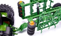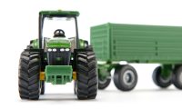 Yksityiskohtainen John Deere traktori ja perävaunu. Paljon ominaisuuksia: kallistettava perävaunu, avautuva vasemmanpuoleinen portti, takakoukku kaksiakselisessa perävaunussa. Loistava lisä muihin SIKU Maanviljelijä sarjan tuotteisiin. Mittakaava: 1:50, Materiaali: metalli/muovi, Mitat: 26.3 x 5.6 x 6.8 cm.