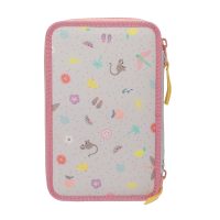 TOPModel JUICY -penaalin kolme vetoketjuin suljettavaa kerrosta sulkee sisälleen kaiken mitä piirtämiseen ja kirjoittamiseen tarvitset: puuvärikynät ja tussit, 18 kappaletta kutakin, 2 lyijykynää, viivoittimen, sakset, liiman, pyyhekumin ja teroittimen! Vetoketjussa on rengas, johon on helppo kiinnittää erilaisia riipuksia.