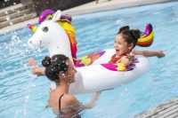 Taianomainen yksisarvinen kuljettaa uimarin satumaiselle uintiretkelle. Sateenkaaren värisin yksityiskohdin koristellun uimarenkaan koko on 119 x 91 cm. Pakkaus sisältää uimarenkaan ja paikkatarran. Ikäsuositus yli 10-vuotiaille.